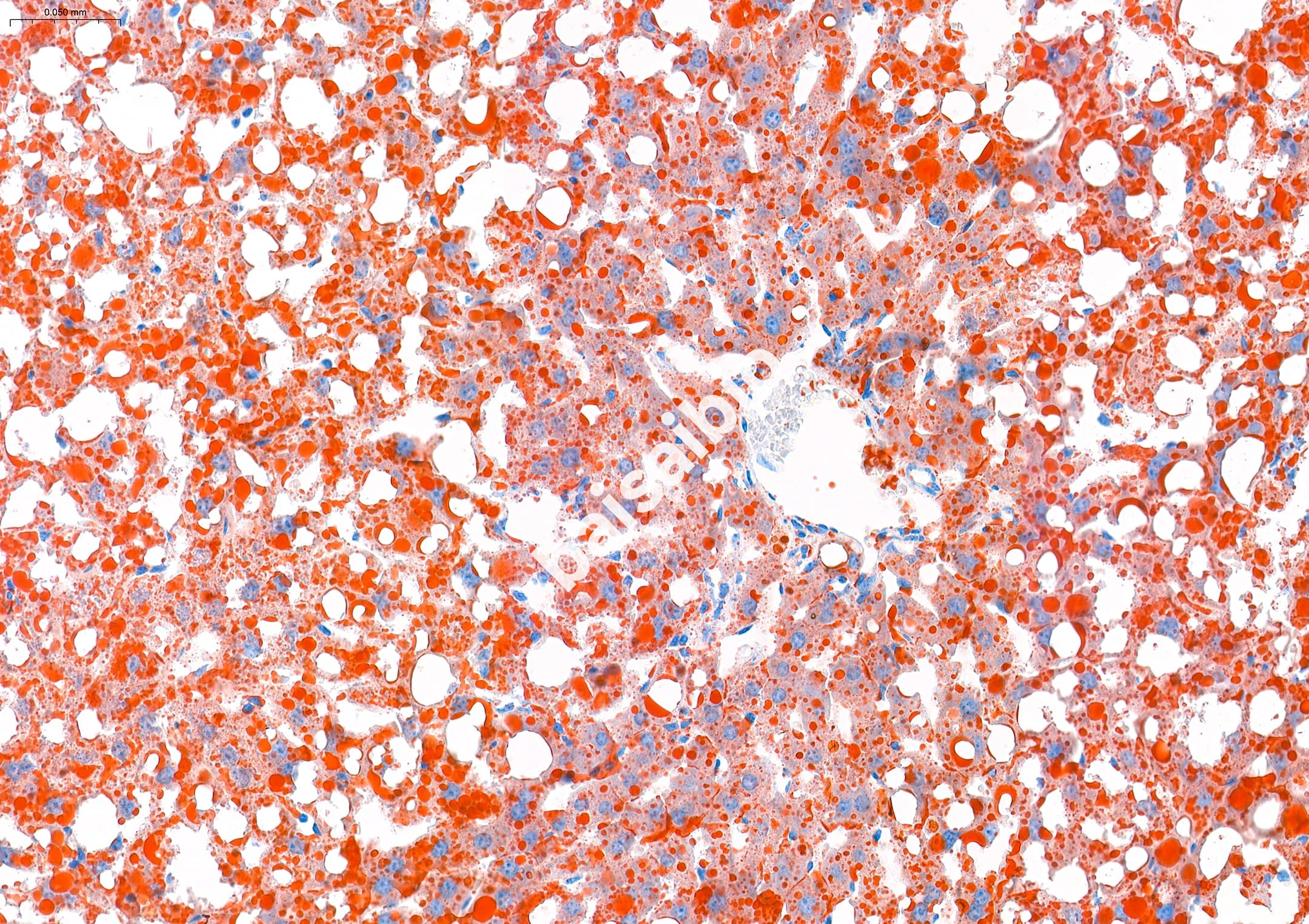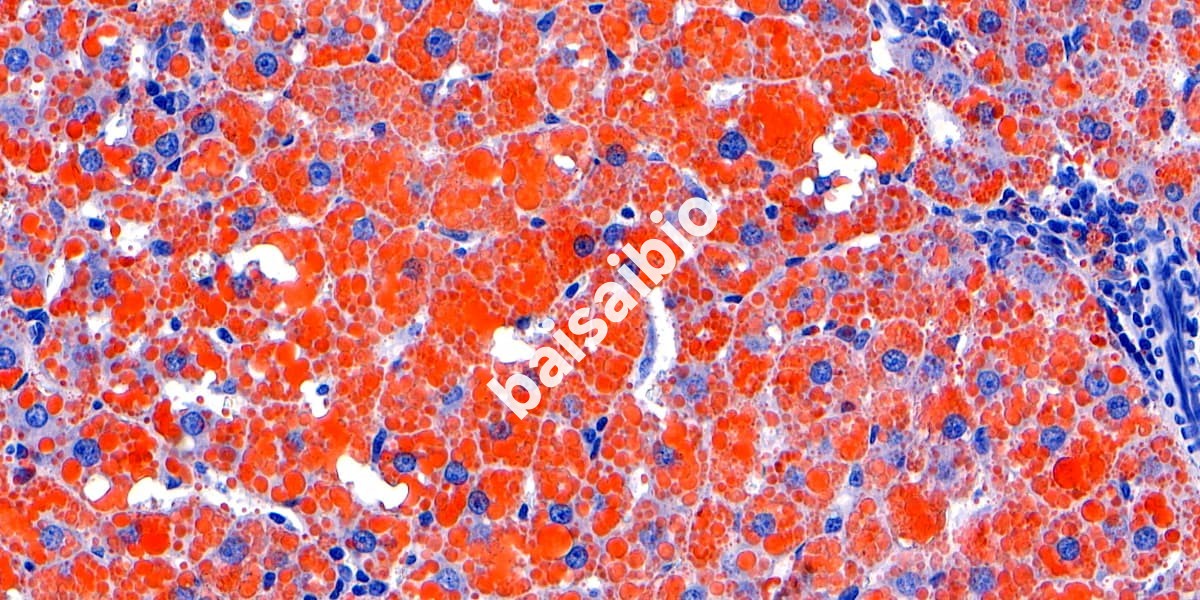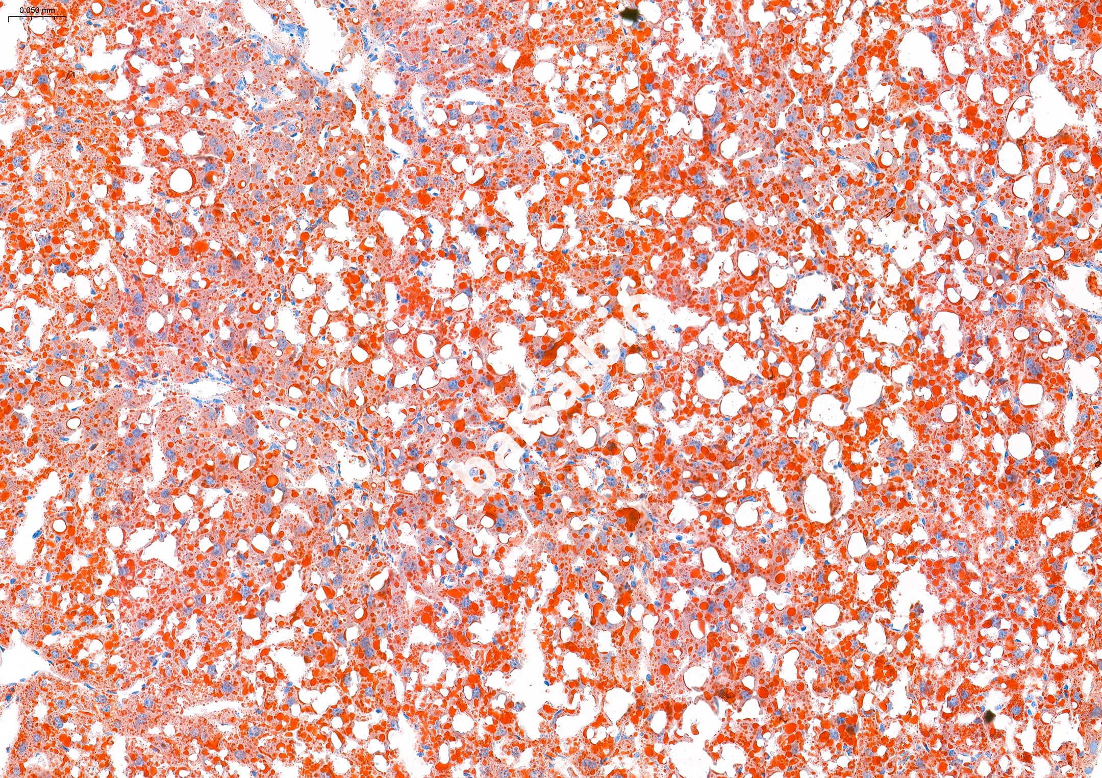 油红O在日常病理诊断和科研工作中为了显示组织内的脂肪常采用油红O进行染色的方法,油红O为脂溶性染料,在脂肪内能高度溶解,可特异性的使组织内甘油三酯等中性脂肪着色。